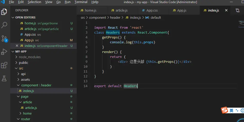 export default App;以上我在header这个组件中 输出props 运行项目,你会发现控制输出的props是空的。