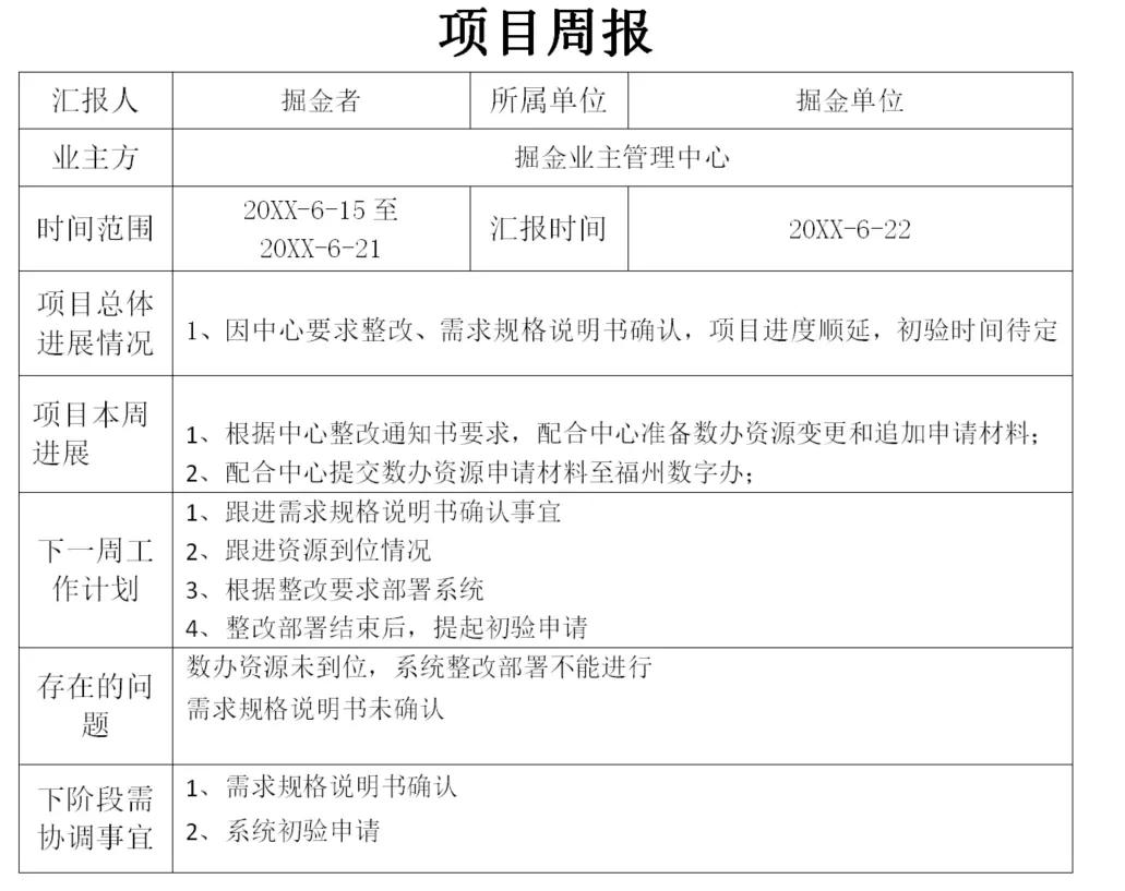 例子2:(模拟示例,敏感文字脱敏)某项目经理周报