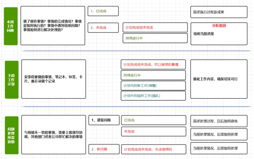 - 逻辑结构按需调整,明确的说明:本周工作内容、下周工作计划、问题处理及所需协助。