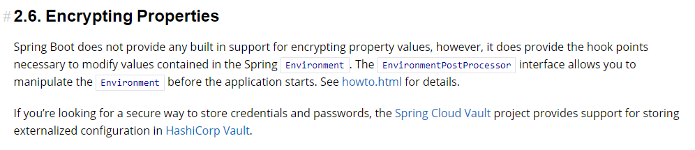 2.6。加密属性 Spring Boot不提供对加密属性值的任何内置支持,但是,它提供了修改Spring包含的值所必需的挂钩点Environment。该EnvironmentPostProcessor界面允许您Environment在应用程序启动之前进行操作。有关详细信息,请参见howto.html。