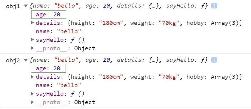 let obj1 = { name: "bello", age: 18, sayHello: function () { console.log("你好呀"); }, details: { height: "180cm", weight: "70kg", hobby: ["打游戏", "跑步", "看电影"], }, }; let obj2 = obj1; obj2.age = 20; console.log("obj1", obj1); console.log("obj2", obj2);上面例子中,把 obj1 的内容赋值给 obj2,当修改obj2 中属性 age 值为20后,打印结果如下: