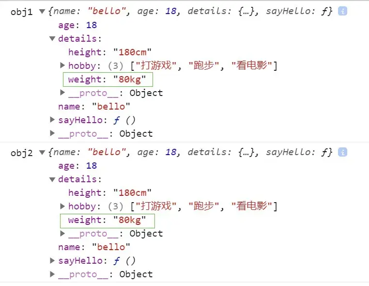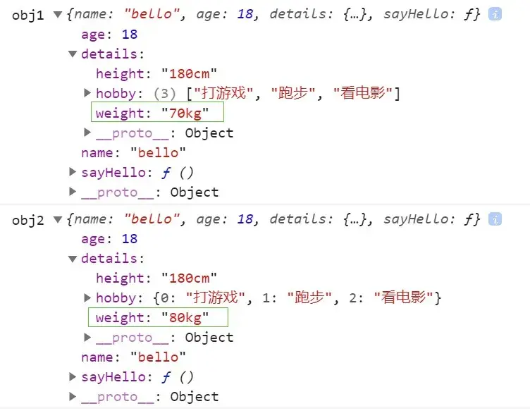 let obj1 = { name: "bello", age: 18, sayHello: function () { console.log("你好呀"); }, details: { height: "180cm", weight: "70kg", hobby: ["打游戏", "跑步", "看电影"], }, }; // 如果要修改 details 中属性时 let obj2 = {}; for (var key in obj1) { obj2[key] = obj1[key]; } obj2.details.weight = "80kg"; console.log("obj1", obj1); console.log("obj2", obj2);当修改 obj2 深层属性 weight 时,结果如下图