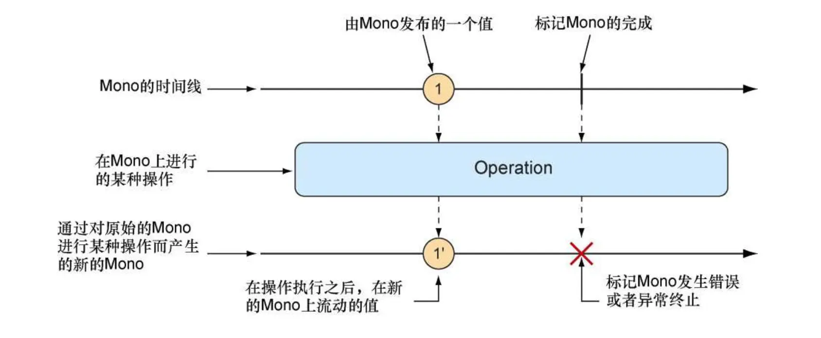 这个例子中的Mono是Reactor的两种核心类型之一,另一个类型是Flux。两者都实现了反应式流的Publisher接口。Flux代表具有零个、一个或者多个(可能是无限个)数据项的管道.