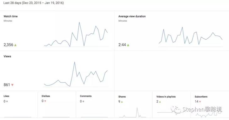 Youtube提供了多种维度的数据监控和分析功能,如果你没有善加利用,那么肯定错过了很多机会。 从“概览报告”开始,可以查看过去28天内的内容效果情况。