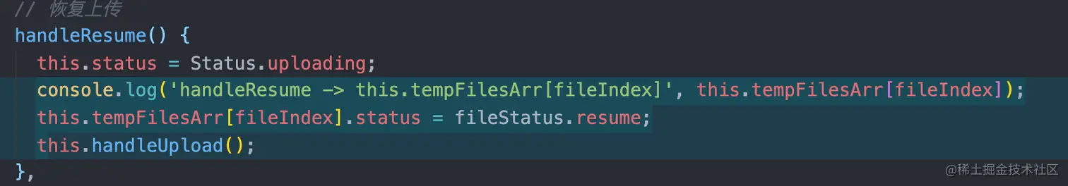 当我们点击恢复后,由于会重新上传未上传成功的切片,所以,进度条就会有倒退的情况,针对这个问题,处理也简单。 定义临时变量fakeUploadProgress在每次暂停时存储当前的进度,在上传恢复后,当当前进度大于fakeUploadProgress的进度,再进行赋值即可。