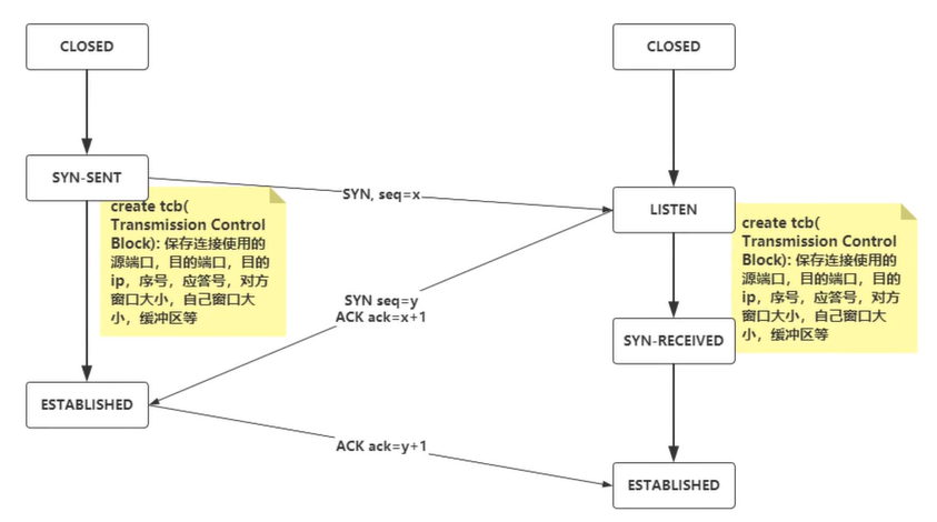 客户端收到后,发送ack,seq=x+1,ack=y+1给服务器端,状态变为established,服务器收到后,状态变成established。