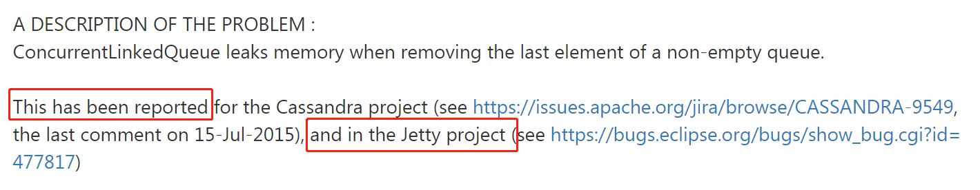 这次的文章从JDK的J.U.C包下的ConcurrentLinkedQueue队列的一个BUG讲起。jetty框架里面的线程池用到了这个队列,导致了内存泄漏。