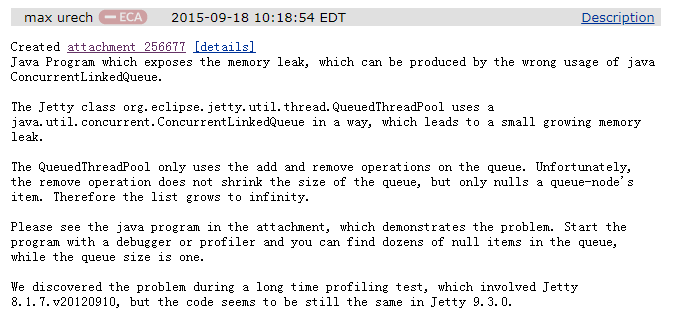 在 jetty 的 QueuedThreadPool 这个线程池里面,使用了 CLQ 这个队列,它会导致内存缓慢增长,最终引发内存泄漏。