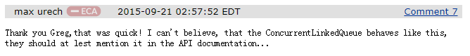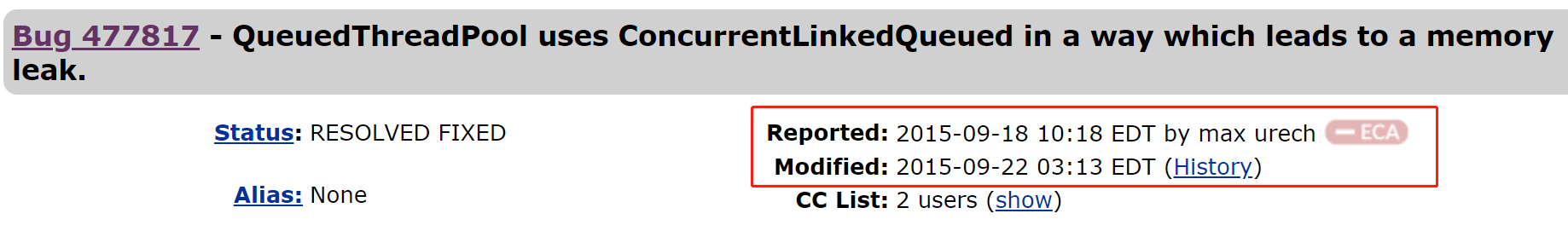 虽然 QueuedThreadPool 仅仅使用了这个队列的 add 方法和 remove 方法。但不幸的是,remove 方法不会把队列的大小变小,只会使队列里面被删除的 node 为空。因此,该列表将增长到无穷大。
