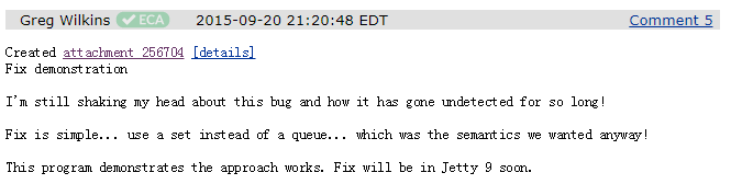 他说:我还在为这个 BUG 摇头,它怎么这么久都没被发现呢!对于 jetty 来说修复起来非常的简单,使用 set 结构代替 queue 队列即可实现一样的效果。