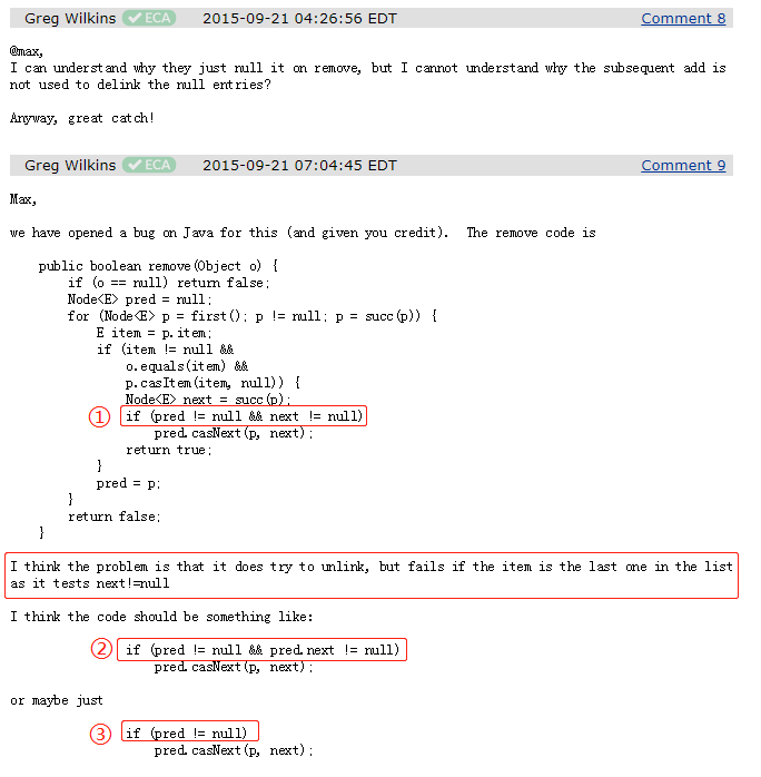 他给出的解决方案也很简单,就是标号为②、③的地方。总之,只需要让代码执行 pred.casNext 方法就行。