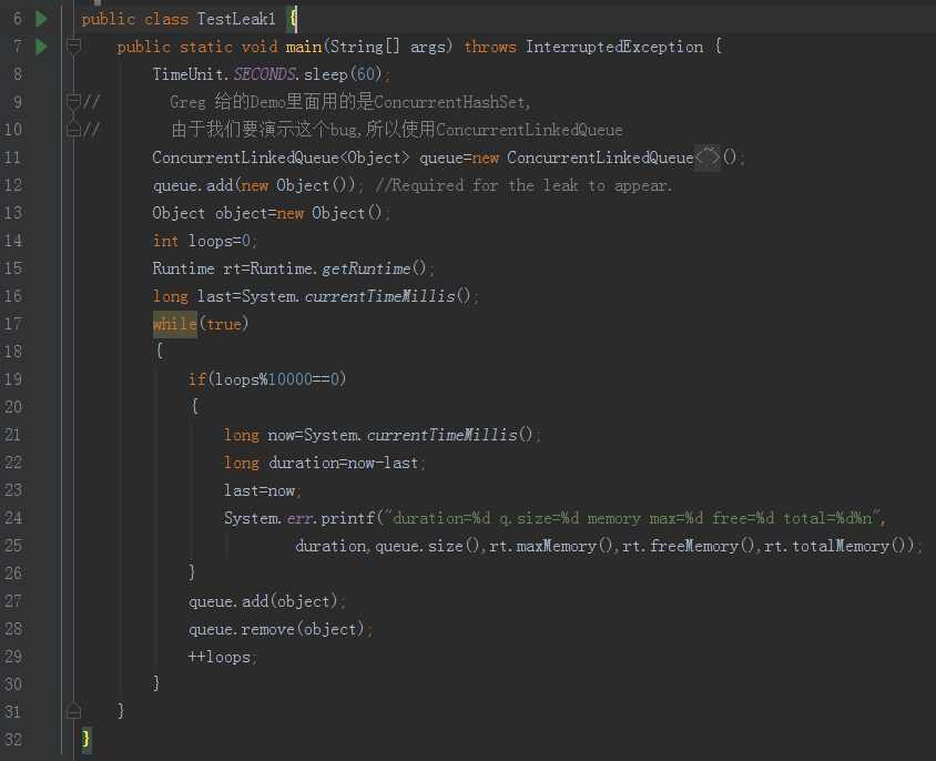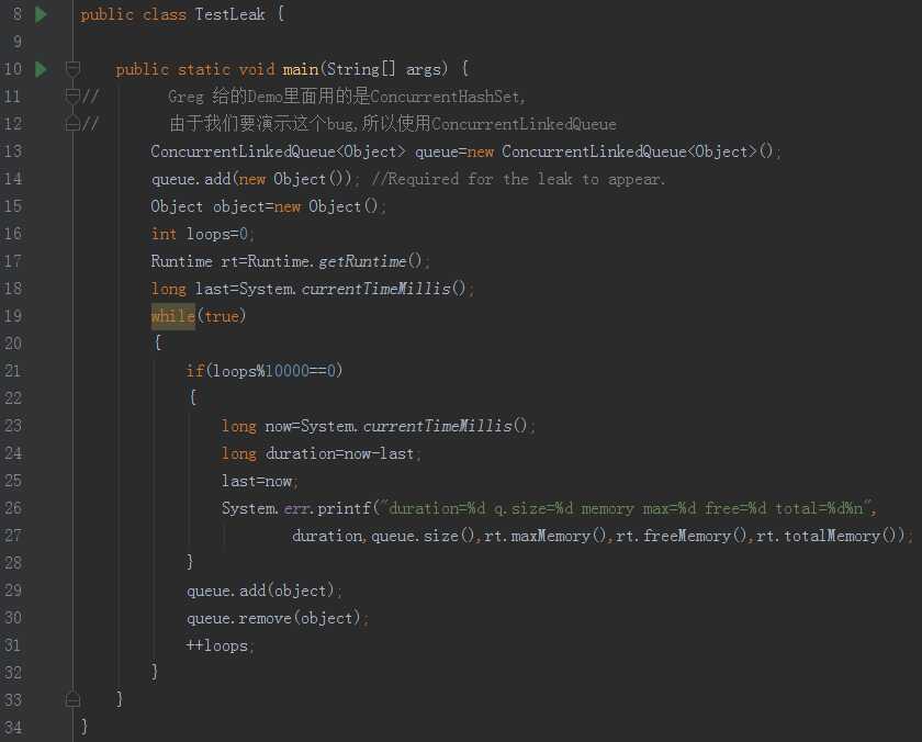 注意第 13 行,因为 Greg 给的是修复 Demo,所以用的是 ConcurrentHashSet,由于我们要演示这个bug,所以使用 CLQ。