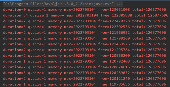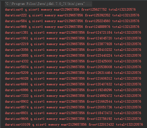 这个 Demo 就是在死循环里面调用 queue 的 add(obj) 和 remove(obj) 方法。每循环 10000 次,就打印出时间间隔、队列大小、最大内存、剩余内存、总内存的值。