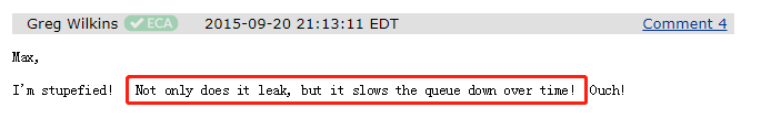 他说:卧槽,我发现它不仅导致内存泄漏,而且会随着时间的推移,导致队列越来越慢。太TM震惊了。
