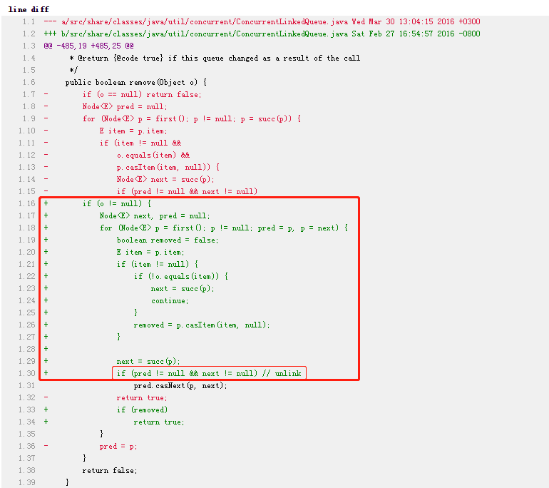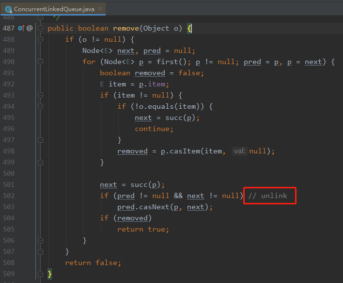 JDK 1.8.0_212 版本的源码里面,在 CLQ 的 remove(obj) 方法的 502 行末尾注释了一个 unlink。