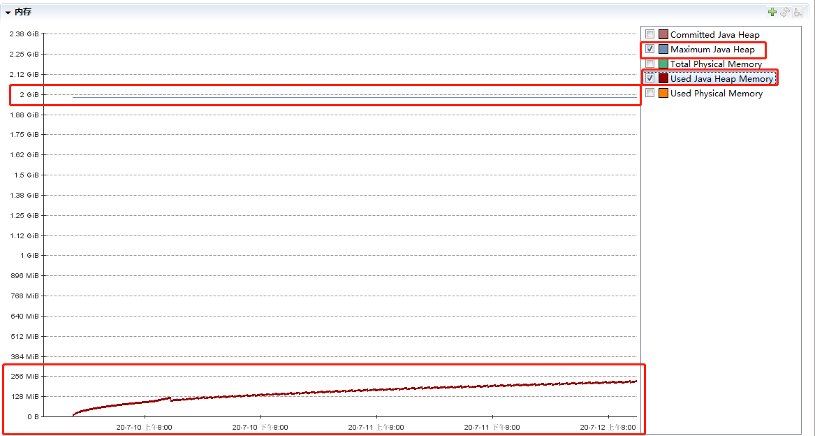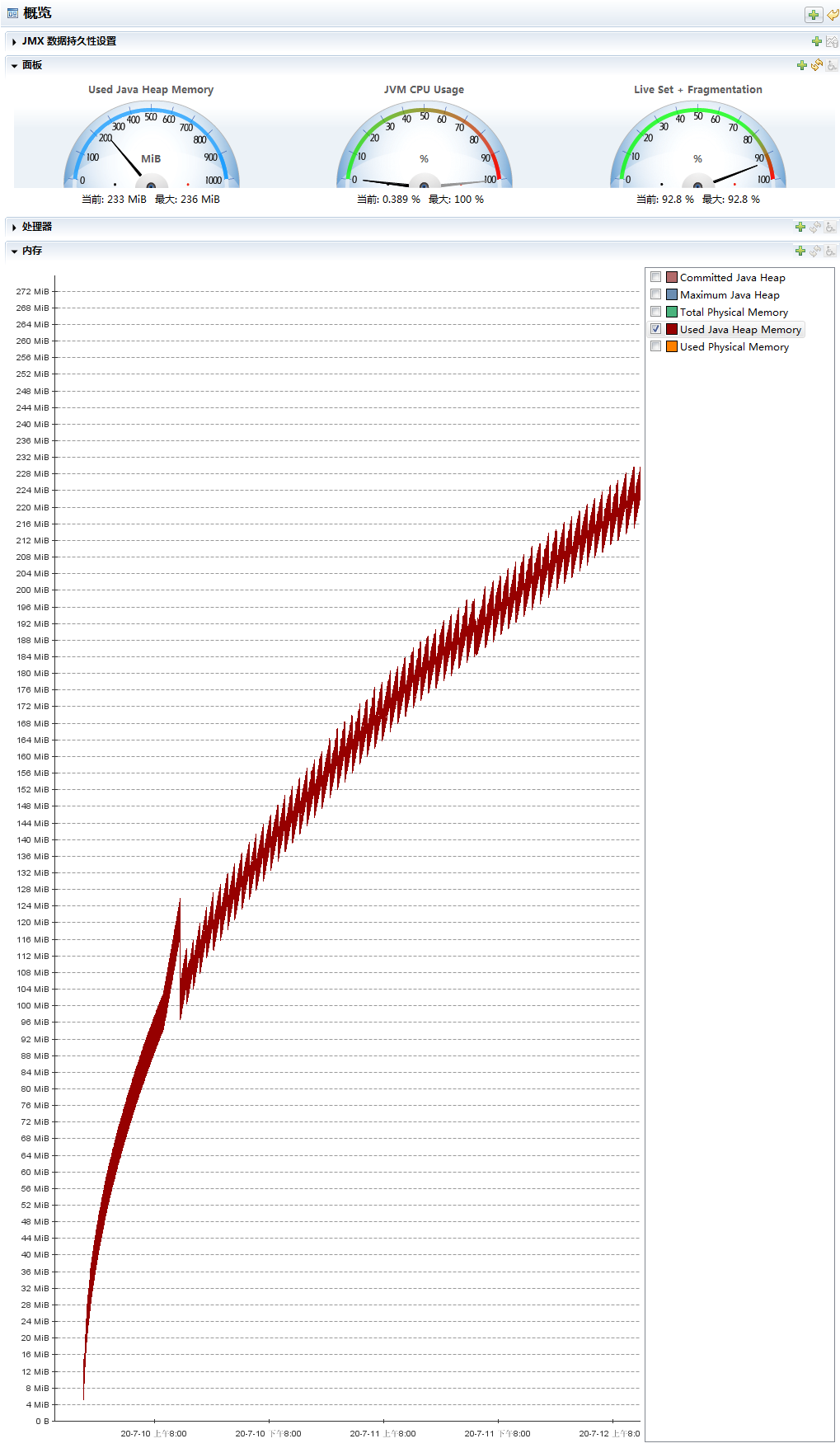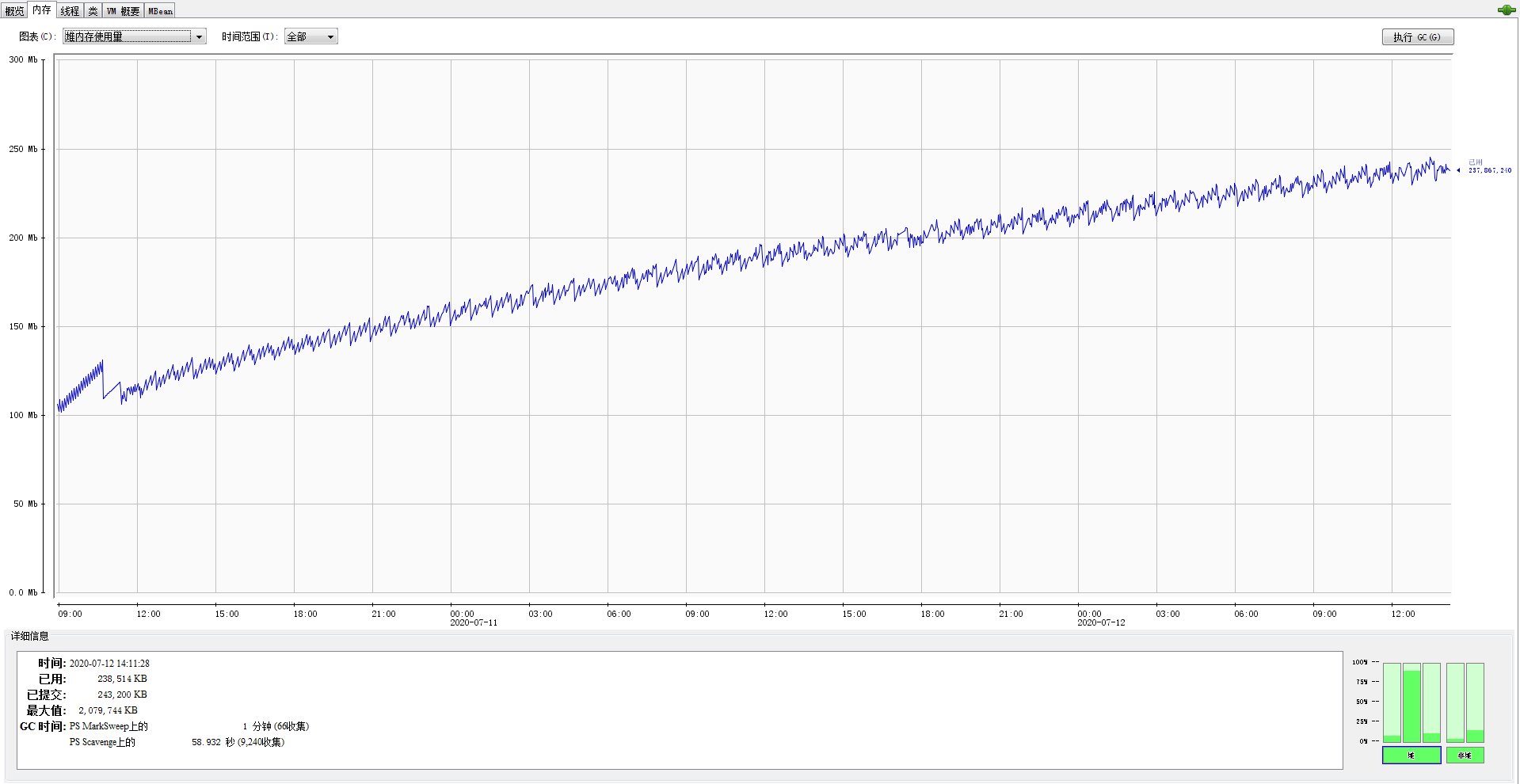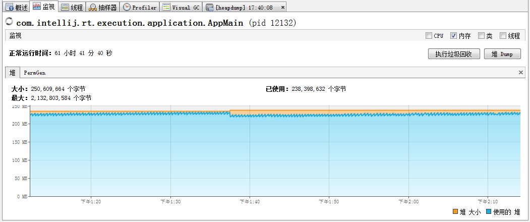 可以看到整个堆内存的使用量是一个明显的、缓慢的上升趋势。