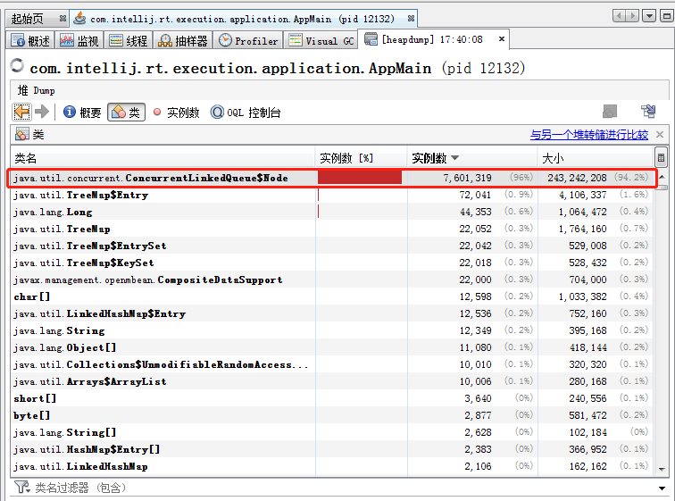 在 VisualVM 里面,我们可以直接 Dump 堆,然后进行分析: