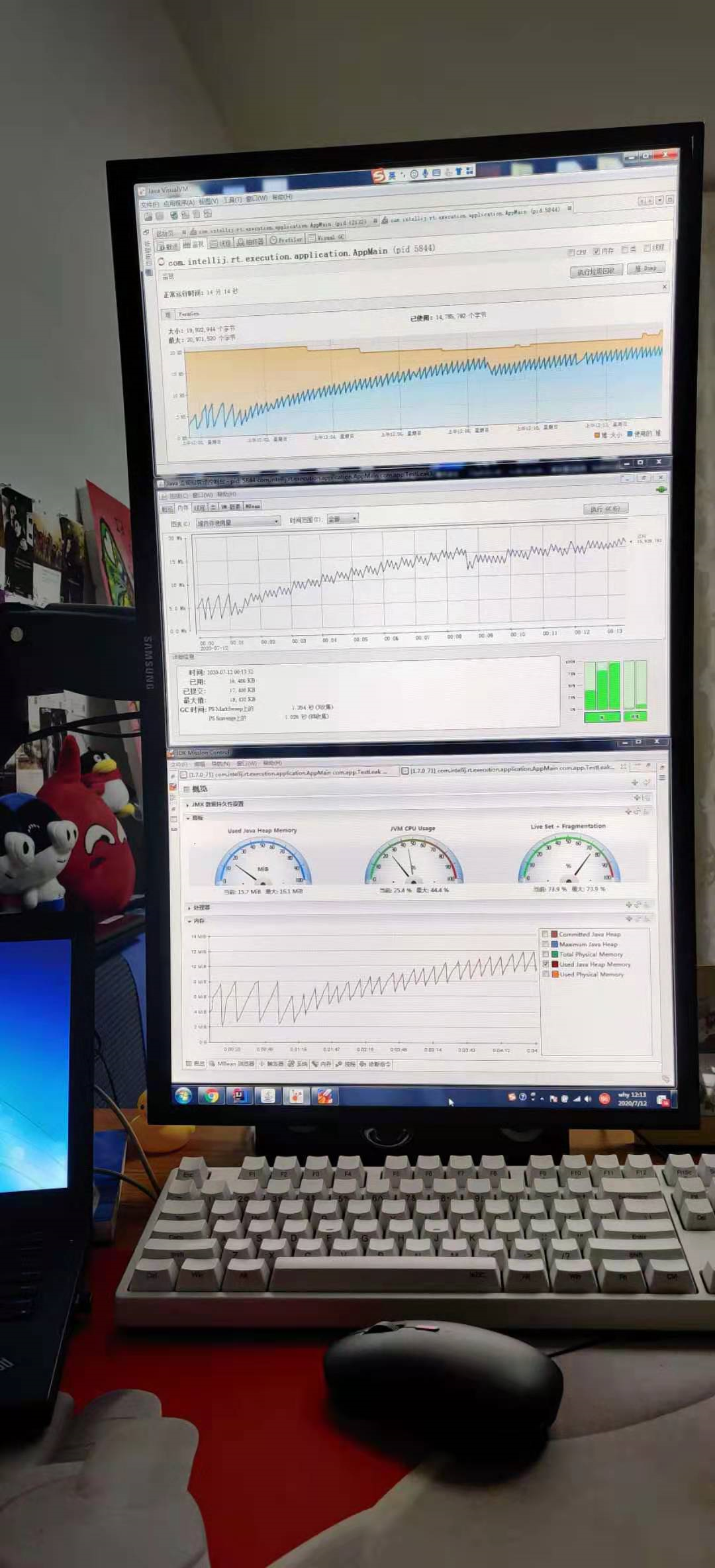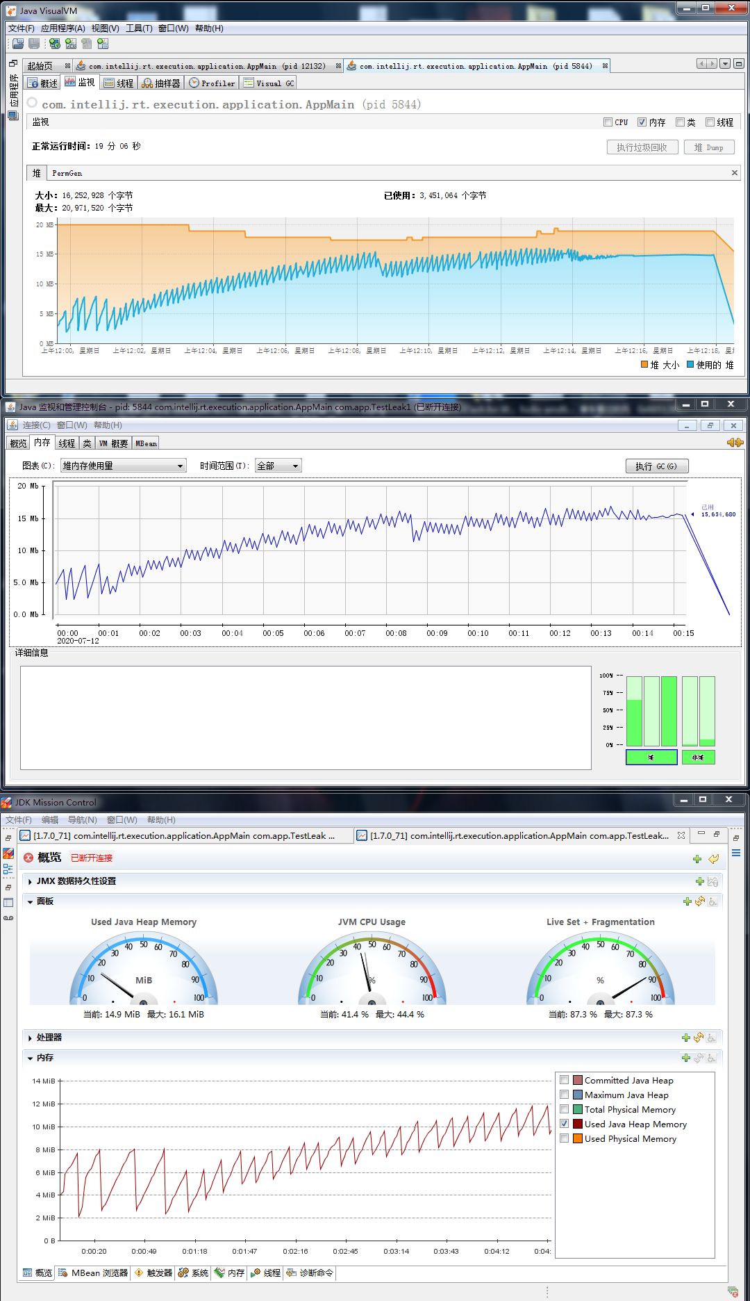 运行起来之后,我们同时通过工具来查看内存变化,下面三个图从上到下的工具分别是 VisualVM、jconsole、jmc: