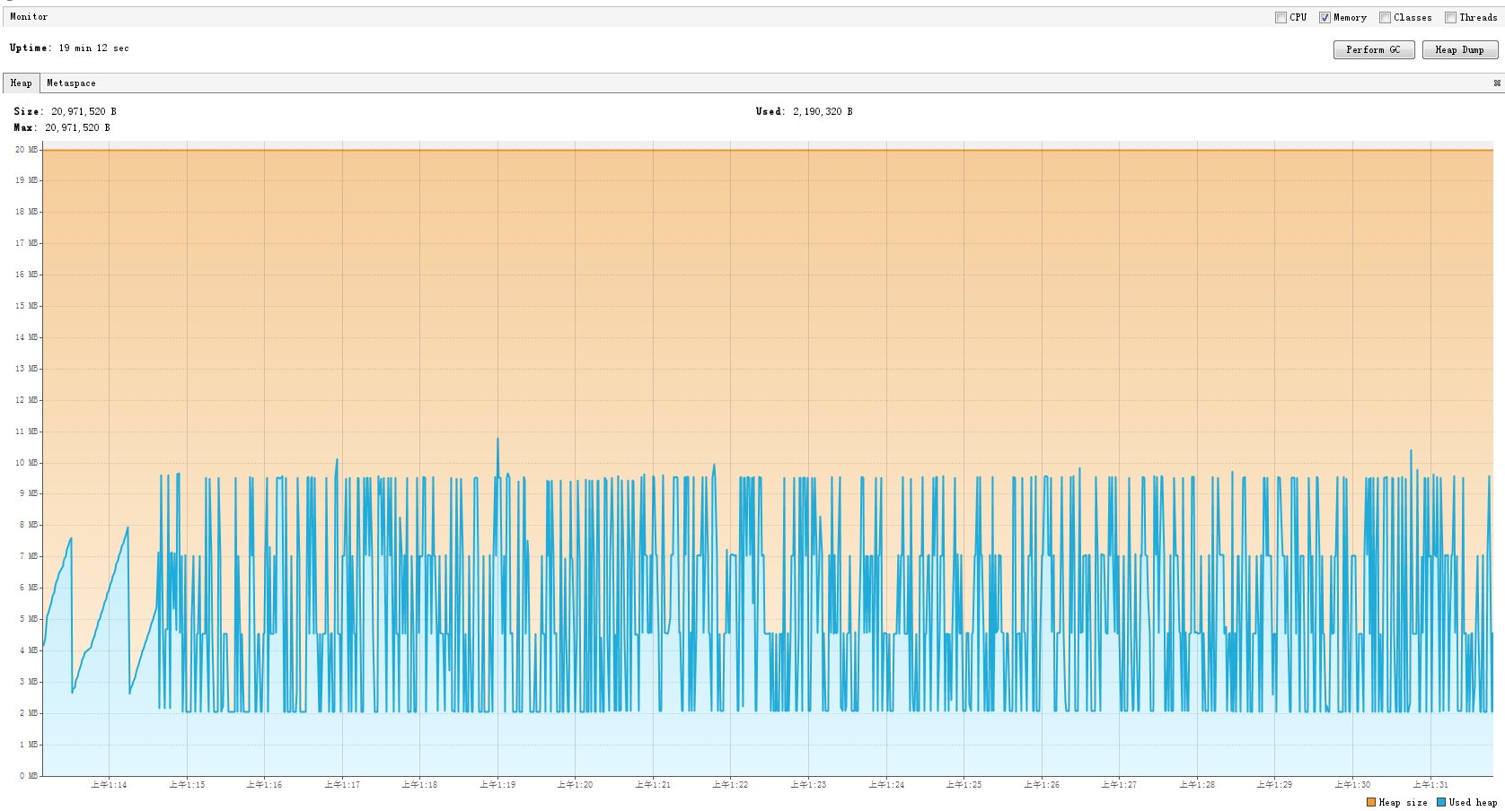 然后用 VisualVM 检测内存,同样跑 19 分钟后截图如下: