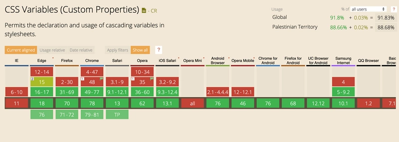 所有主流浏览器都支持CSS变量,下面是各个浏览器的支持情况: