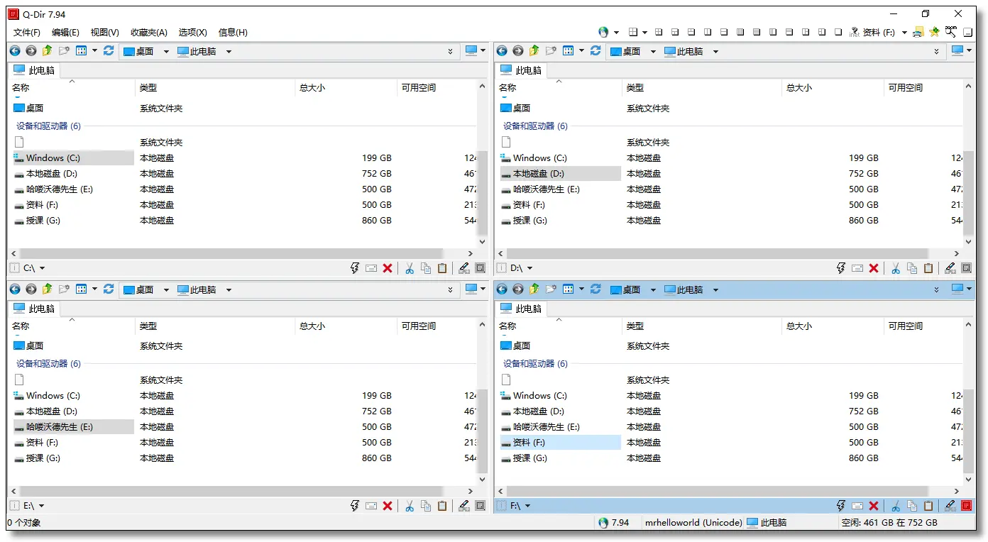 Q-Dir 可以快速轻松地访问您的硬盘,网络文件夹,U盘,软盘和其他存储设备,是 Windows 的绝佳替代文件管理器。Q-Dir 支持多开操作,启动一次 4 个小窗口,启动多次就拥有了更多小窗口,我平时启动 2 次基本就够用了。