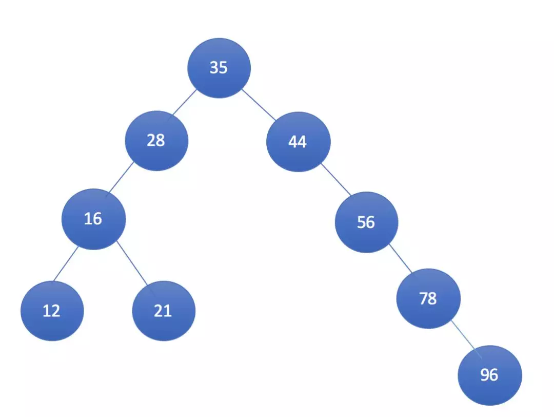 现有数组35,28,16,44,56,78,12,96,21, 构建排序二叉树。