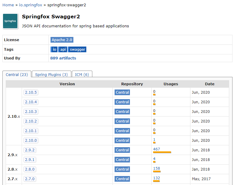 首先我们选择下需要升级的版本,直接去Maven仓库看下,哪个版本使用的比较多。虽然有最新版本2.10.x,但是几乎没什么人用,而上一个版本2.9.x使用的人却很多,看样子还是2.9.x版本比较稳定,我们选择升级到2.9.2版本。