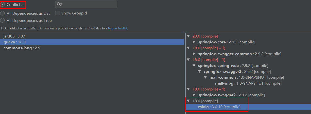 Maven Helper这款IDEA插件,直接查看mall-admin项目是否存在依赖冲突,guava版本果然冲突了;