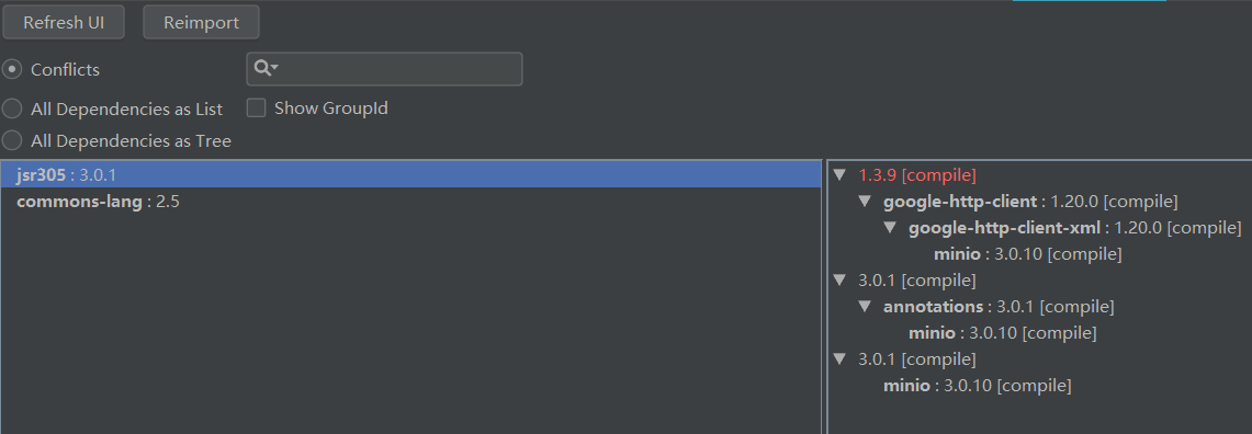 - 排除完成后发现guava的依赖冲突已经不见了,再次运行