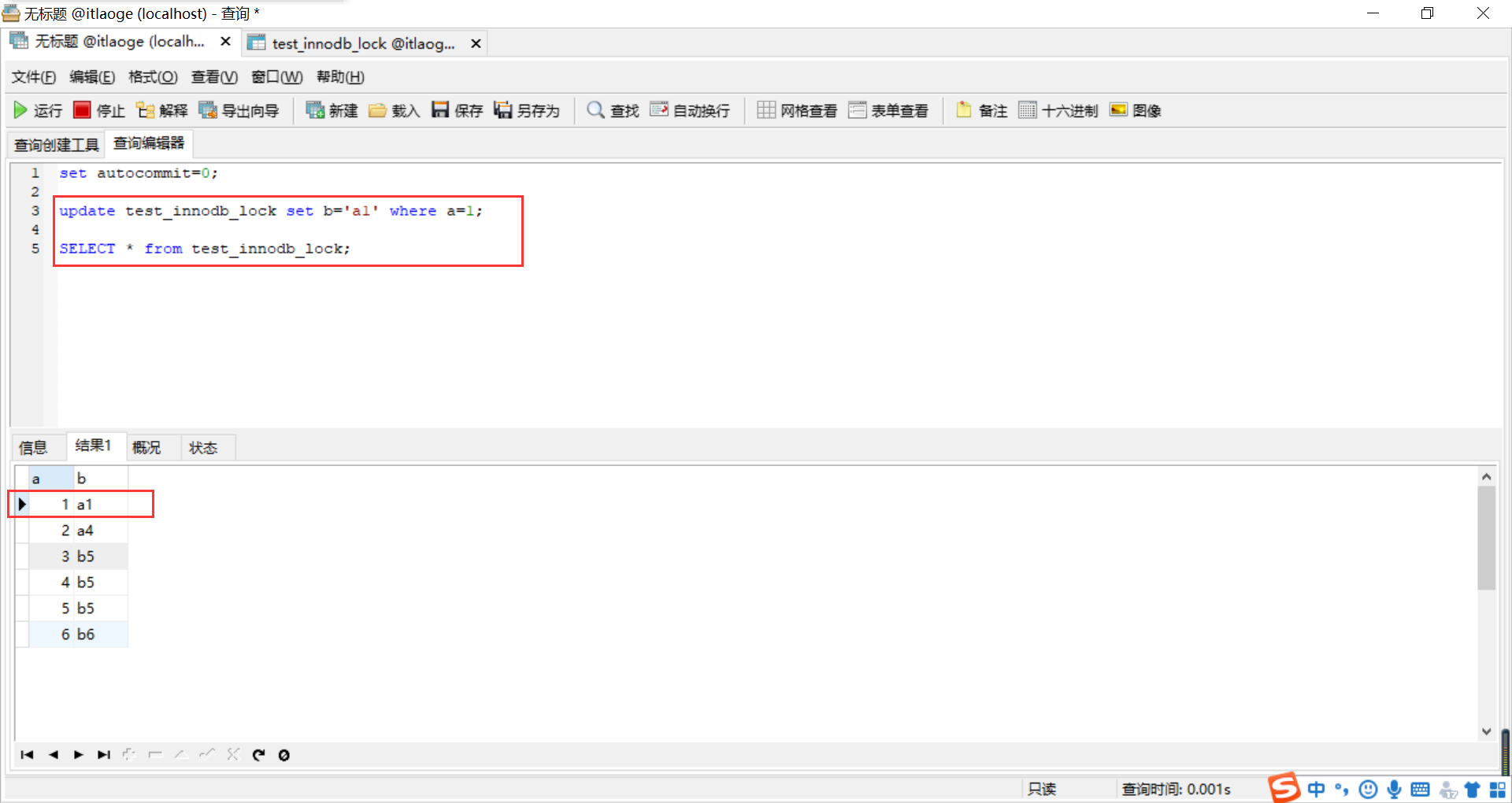 update test_innodb_lock set b='a1' where a=1;