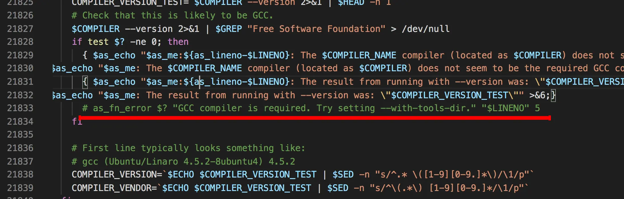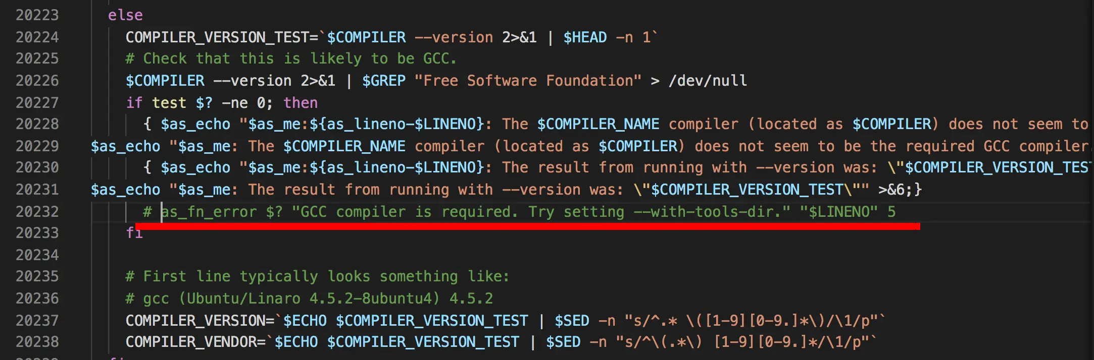 明明系统里已经有编译器,但还是报这个错误。通过后来修改 jdk源码根目录/common/autoconf/generated-configure.sh文件,将相关的两行代码注释后就配置通过了