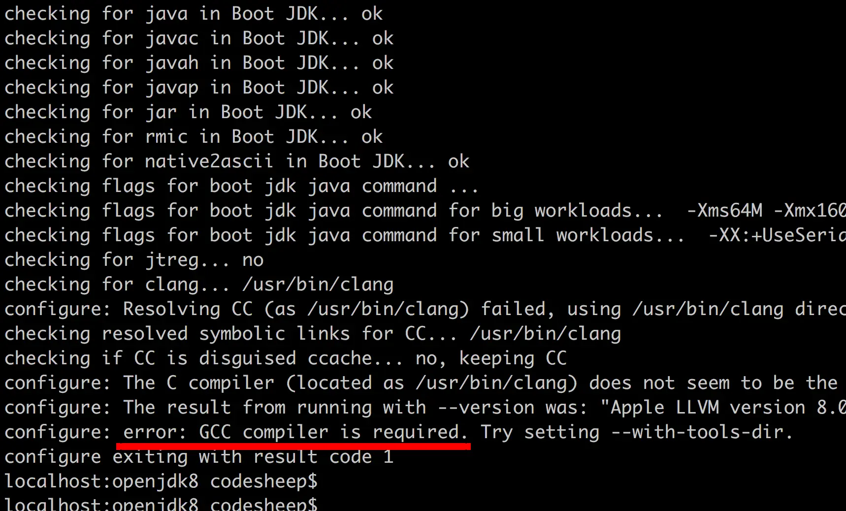 比如我在配置JDK 8的时候,就遇到了一个errof:GCC compiler is required的问题: