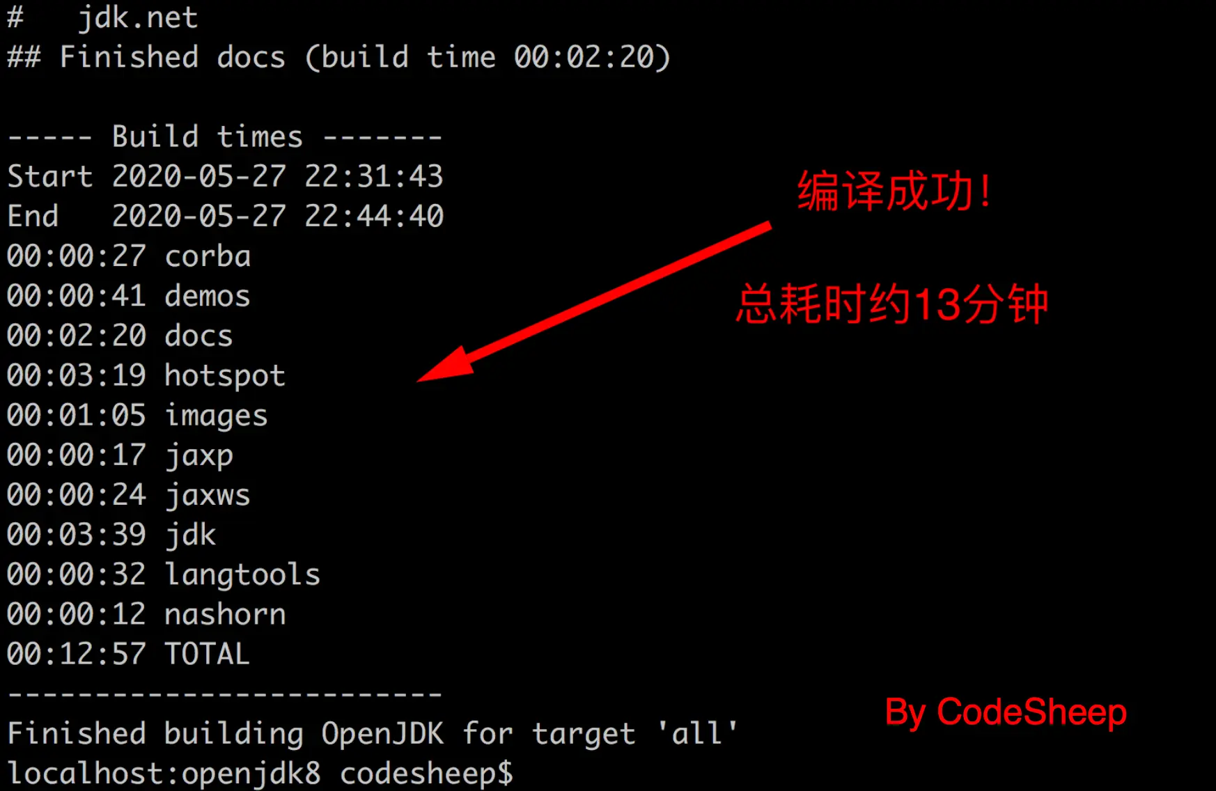 这一步编译需要一点时间,耐心等待一下即可。编译过程如果有错误,会终止编译,如果能看到如下两个画面,那么则恭喜你,自己编译JDK源码就已经通过了,可以搞一杯咖啡庆祝一下了。