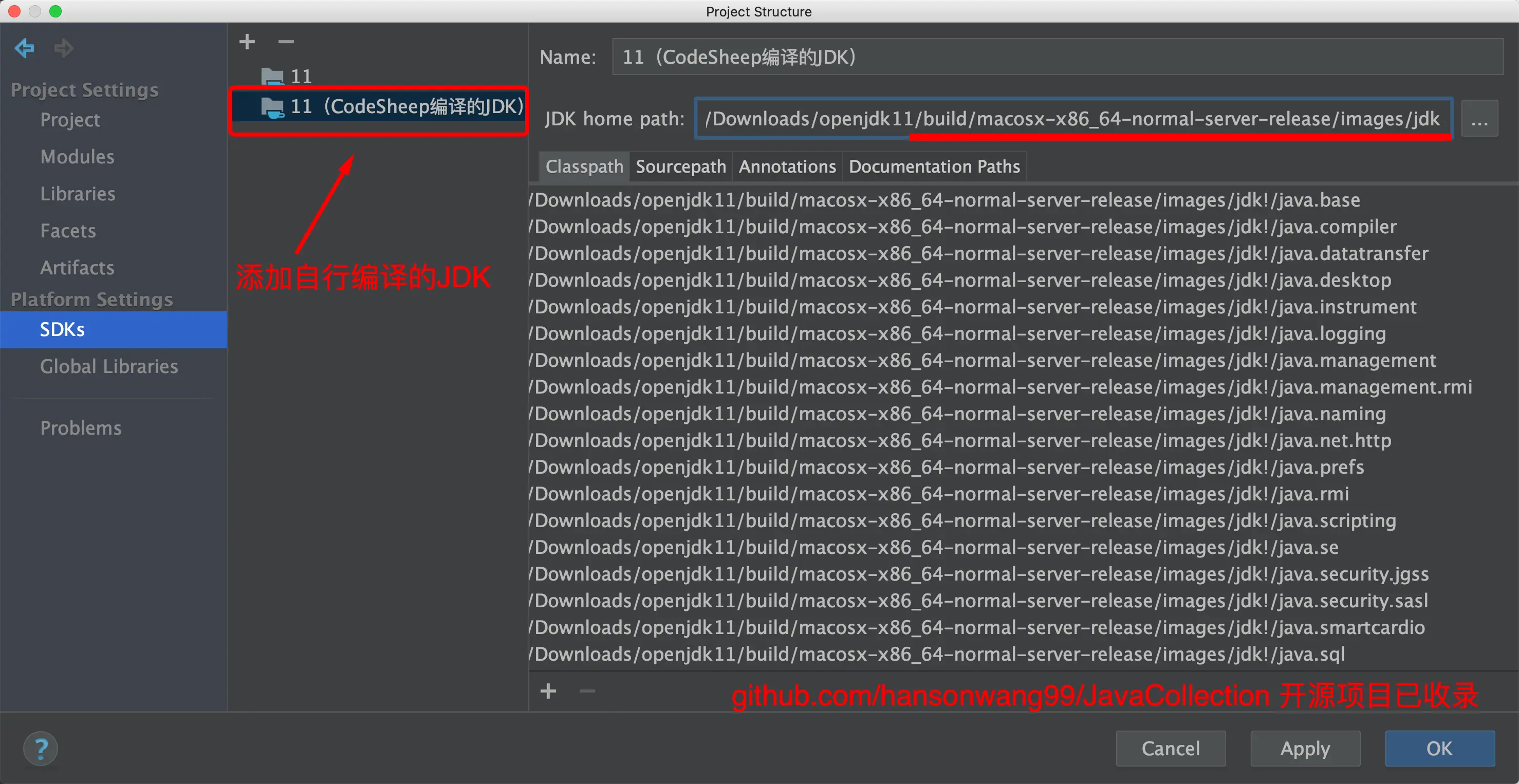 我们点开Project Structure,选到SDKs选项,新添加上自己刚刚编译生成的JDK,并选为项目的JDK,看看是否能正常工作