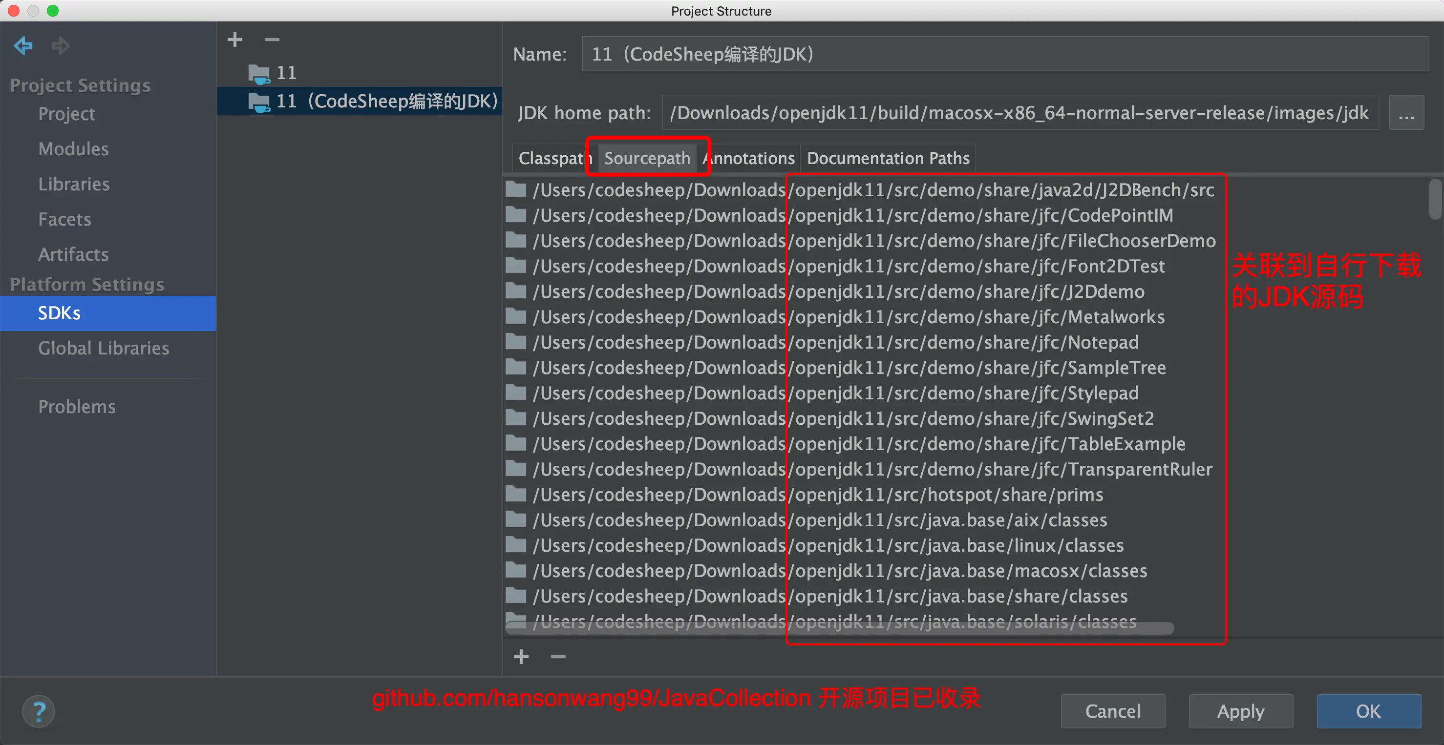 我们继续在上一步JdkTest项目的Project Structure → SDKs里将JDK源码关联到自行下载的JDK源码路径上: