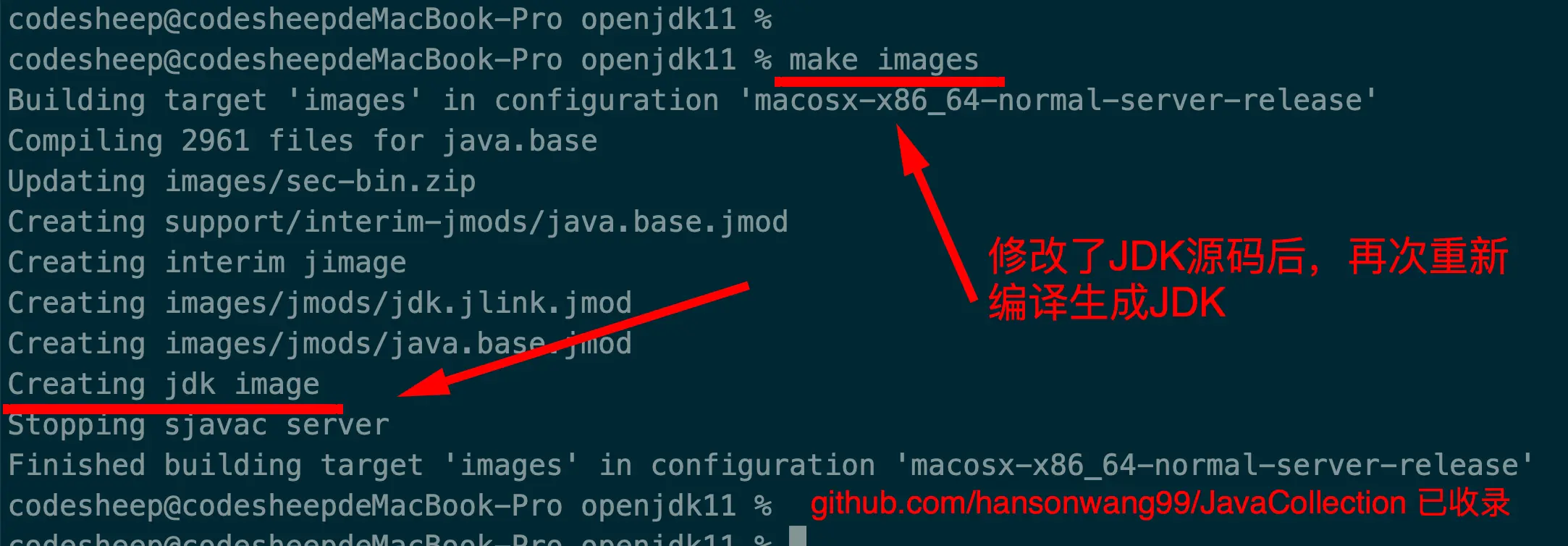 为了使我们新加的代码行生效,我们必须要重新去JDK源码的根目录中再次执行 make images重新编译生成JDK方可生效:
