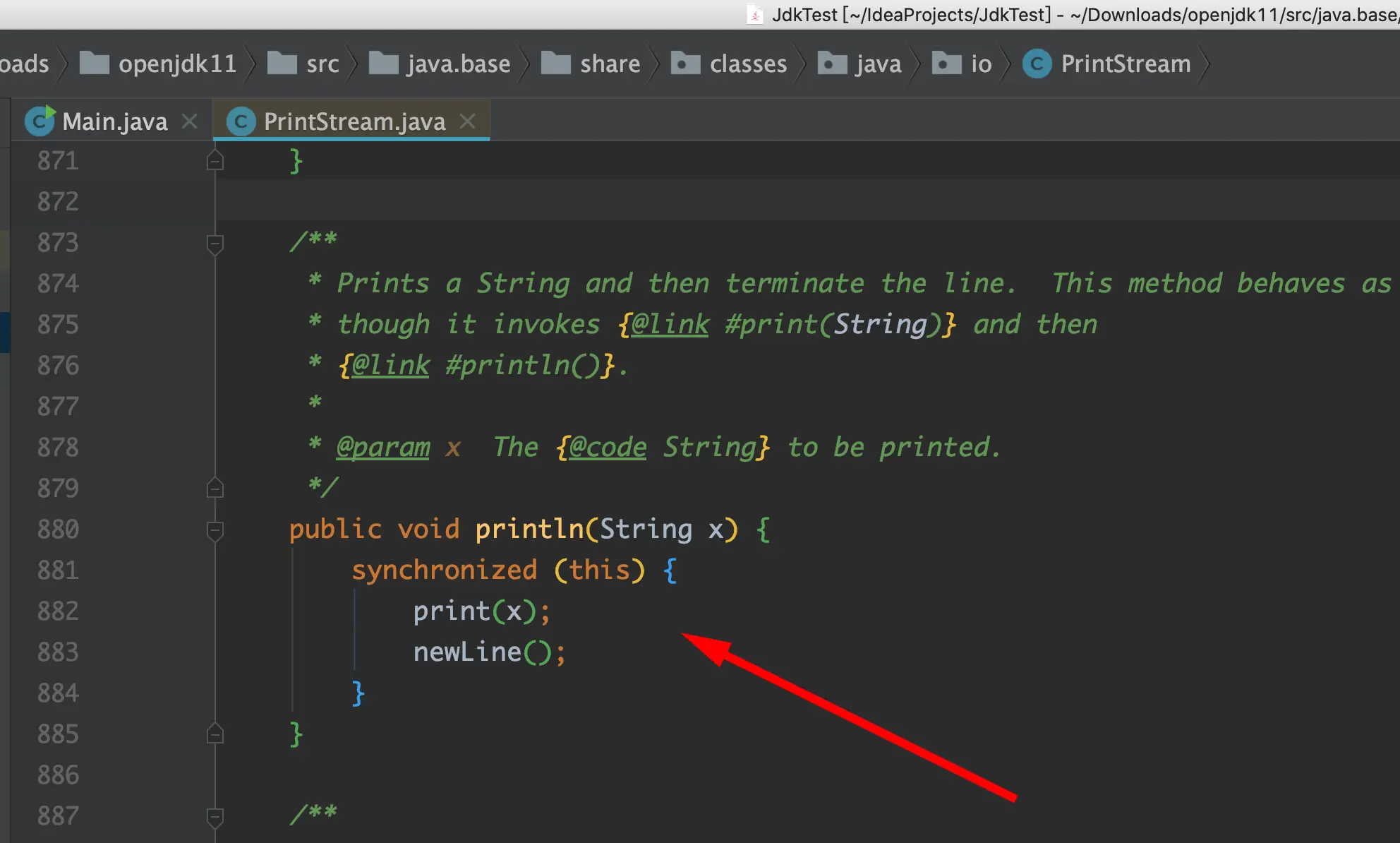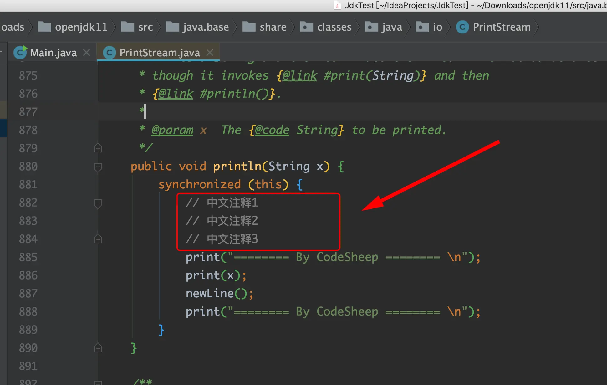 比如,还是以上面例子中最简单的System.out.println()源码为例,我们添加几行中文注释: