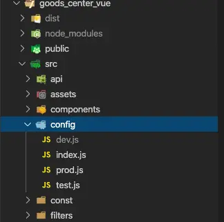 上面我们已经增加了VUE_APP_MODE这个变量,接下来删掉原来src下的config.js,新建config目录,config目录下分别新建dev.js、test.js、prod.js三个配置文件