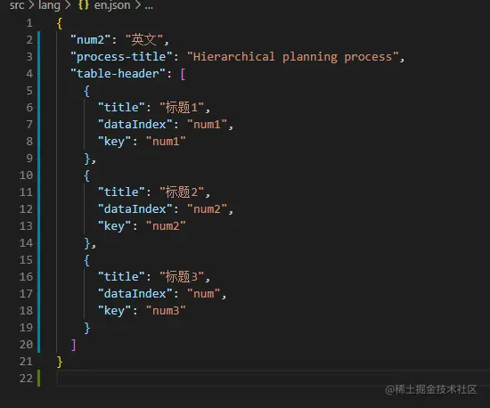 Antd-vue表格表头国际化配置 一个DIV 2020-07-13 685 阅读1分钟 第一步下载 vue-i18n 第二步在src下建立一个名为lang的文件夹 lang文件夹下index的配置 第三步将表格的配置项转成json的格式放入语言包内 第四步在main.js中引入 第五步 -- 最后一步 表格配置 修改之后运行项目,切换语言即可看到效果