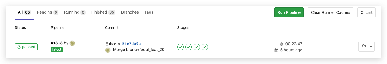 可以看到在具体的项目中集成gitlab CI引用模版库非常的简单,只用引用文件,并根据项目来定义变量即可完成集成。