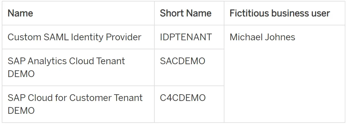 a. In IDPTENANT App: Download IDP metadata and create users b. In SACDEMO App: Download SAC metadata and upload IDP metadata c. In IDPTENANT App: Upload SAC metadata and set user mappings d. In SACDEMO App: Test authentication against IDP into SAC