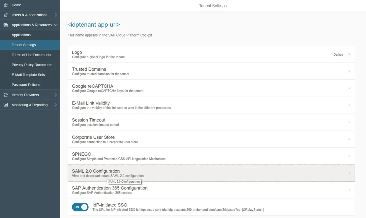 登录IDPTENANT,菜单Applications & Resources->Tenant Settings, 点击SAML 2.0 Configuration,