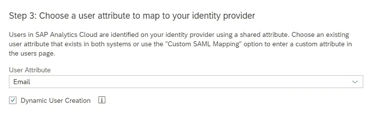 选择将SAP Analytics Cloud tenant上user模型的哪一个字段映射到IDP Tenant上user模型的哪一个字段。我们当然是选择Email字段。