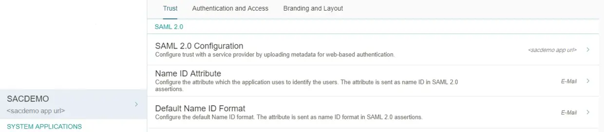 Make sure you set the Name ID Attribute and Default Name ID format to E-Mail as displayed above. This will ensure the SACDEMO users and the IDPTENANT users are mapped via their assigned E-Mail attribute.