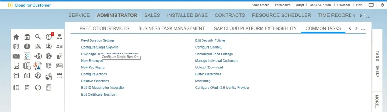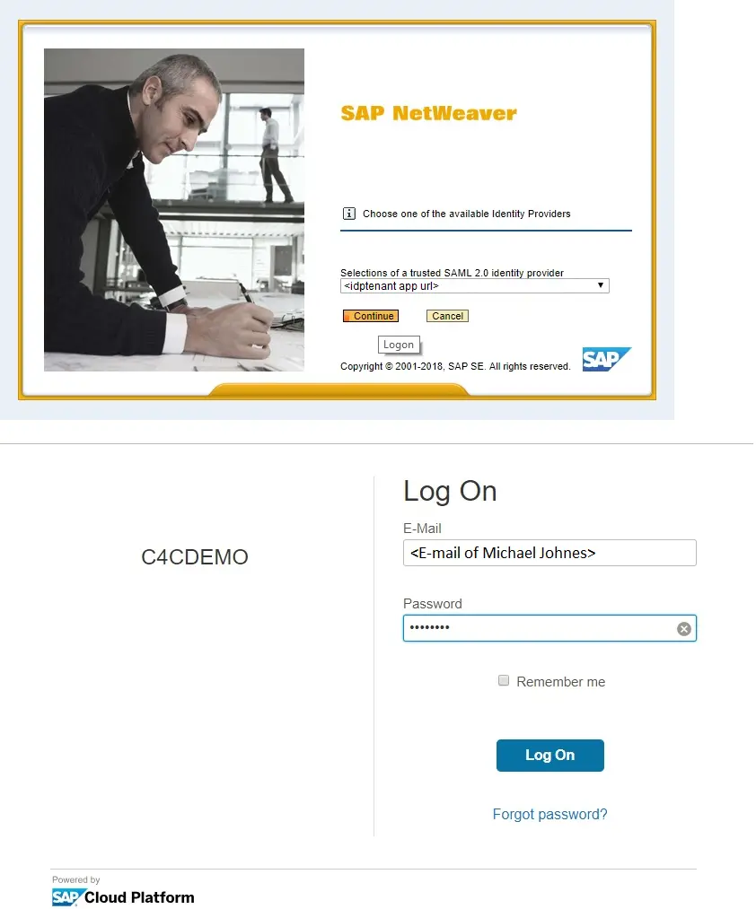 a. In IDPTENANT App: Edit profiles with C4C login names b. In C4CDEMO App: Download C4C metadata and upload IDP metadata c. In IDPTENANT App: Upload C4C metadata and set user mappings d. In C4CDEMO App: Test authentication against IDP into C4C