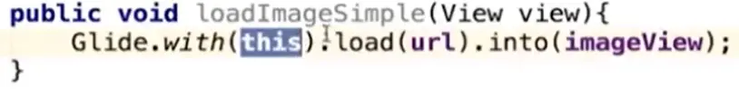 Glide.with: 参数1 -context; 参数2 -加载图片的url; 参数3 -图片显示的控件,imageView。