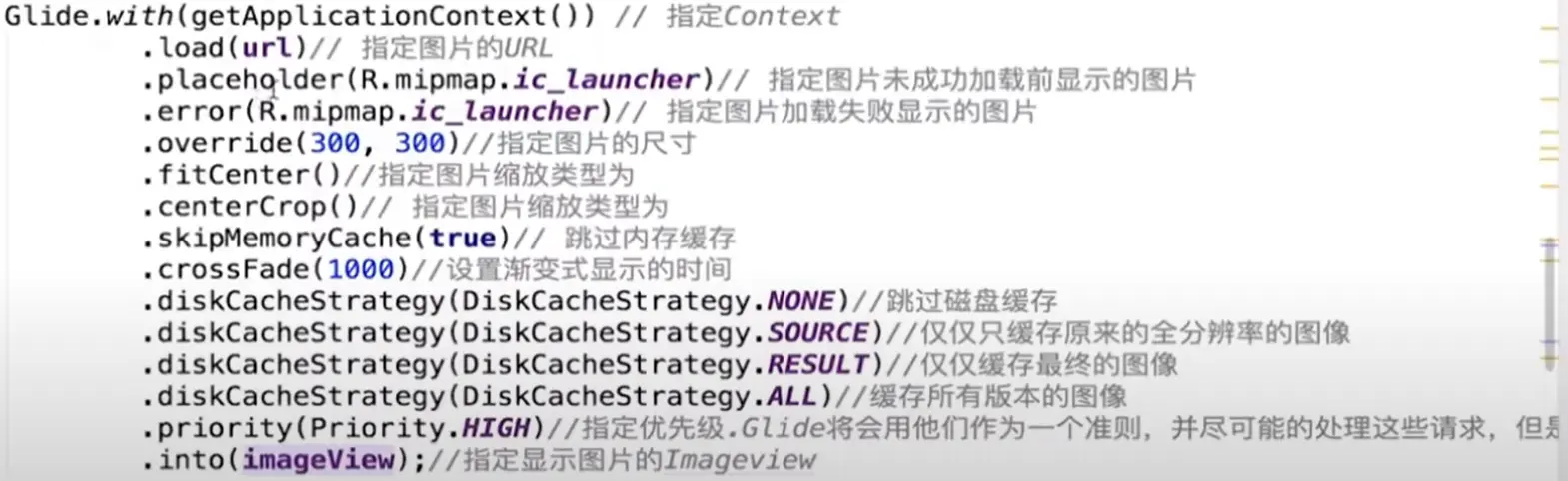 override: 设置图片显示到imageView的大小,压缩图片,避免图片过多地消耗内存,防止内存泄漏。fitCEnter: 缩放图像使图像被完整显示到imageView,但imageView可能不会被填满。centerCrop: 将图片填充imageView,但图片不一定会完整显示可能会被裁剪。skipMemoryCache(true): 告知Glide不把该图片缓存到内存中,但Glide还是会利用磁盘缓存避免重复的网络请求。默认情况下,Glide会使用内存缓存,该参数为false。priority(Priority.HIGH): 优先加载该图片。- Glide会在后台子线程做操作,再切回UI线程显示图片。