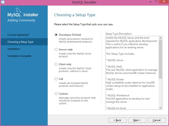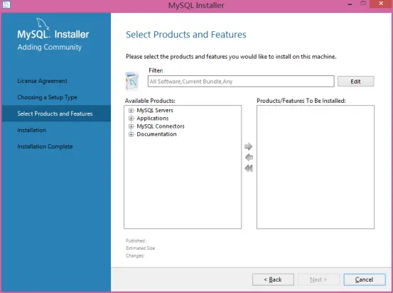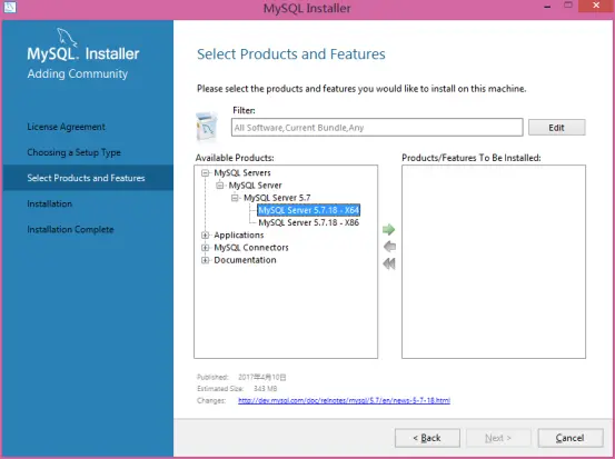 在这里我们需要从安装程序提供的可安装的产品(Products)中选择我们需要的mysql server
