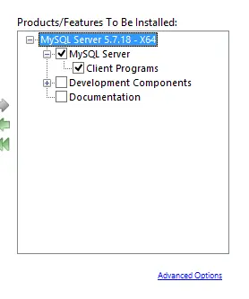 然后点击绿色的向右箭头,将当前Product移动需要安装的列表,然后在右边展开“MySQL Server 5.7.14 - X64”项,取消“Development Components”的勾选(因为我们只需要安装mysql server),之后点击“Next”按钮进入下一步
