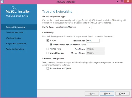 Config Type选择“Development Machine”,选择此项将使用较小的内容来运行我们的mysql server,对应小型软件、学习是完全够用的。之后“Next”